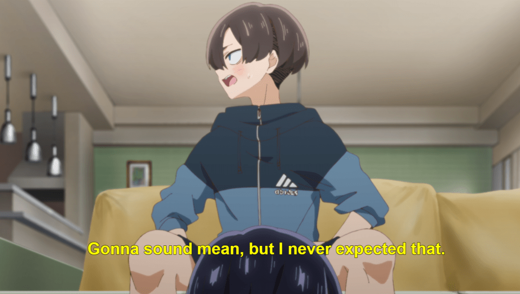So Kyo is out running, trying to take this competition seriously, he runs into Yamada, who gets him to come home with her. Girl breaks out the ab roller and starts doing a set and of course the animators…yall know what you did…..